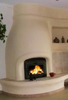Lareira organicamente rebocada está equipada com um compartimento de forno, banco aquecido e uma segunda lareira para as noites frias de verão. Além disso, fornece aquecimento por piso radiante. |