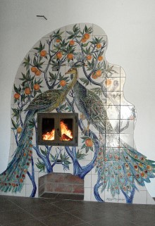 Lareira revestida com azulejos pintados à mão.