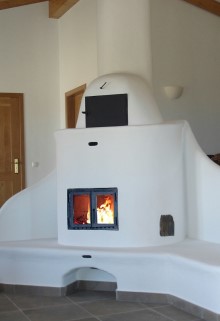 The freestanding Schneider basic stove, with a heated bench, and a baking compartment is integrated in the dome. |